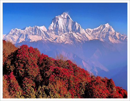 Just try to picture this glacial cirque with all these giants jostling for position: Hiunchuli (6441m), Annapurna South (7219m), Fang (7647m), Annapurna I (8091m), Annapurna III (7555m), Machapuchare (6993m), Tharpu Chuli (5663m), and Singu Chuli (6499m). After just six days of trekking, at a relatively moderate altitude for Nepal, you won’t find anything like it anywhere else. This trek is accessible to all and, in addition to the mountains, offers the chance to pass through traditional villages. The landscapes range from rice paddies to bamboo groves, culminating in an alpine setting at the foot of glaciers. Leaving the Modi Khola valley, which flows down from the sanctuary, is not the end of the trek. We continue through the vast rhododendron forests of Tadhapani to the pass at Ghorepani. This detour allows us to climb to the summit of Pun Hill (named after the Magar people of the village) for an exceptional panoramic view of the Himalayas.